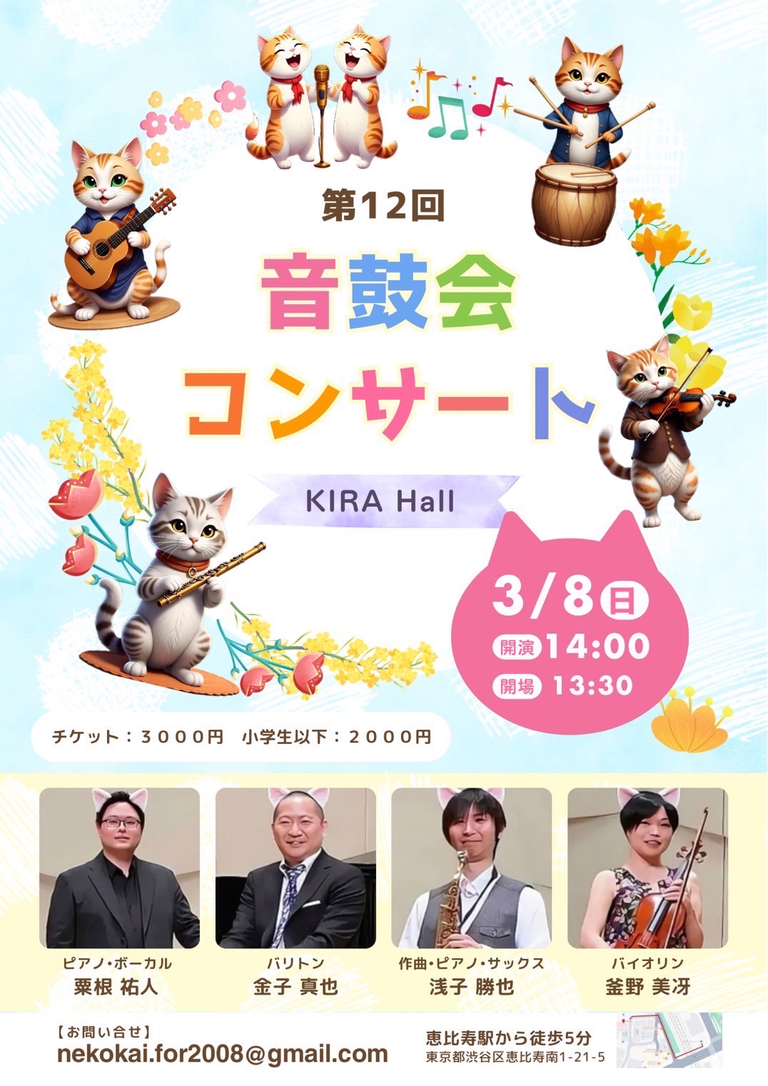 【開催日】2026年3月8日(日) 【開場】13時30分 【開演】14時00分 【出演】粟根 祐人、金子 真也、浅子 勝也、釜野 美冴 【お問い合わせ】nekokai.for2008@gmail.com