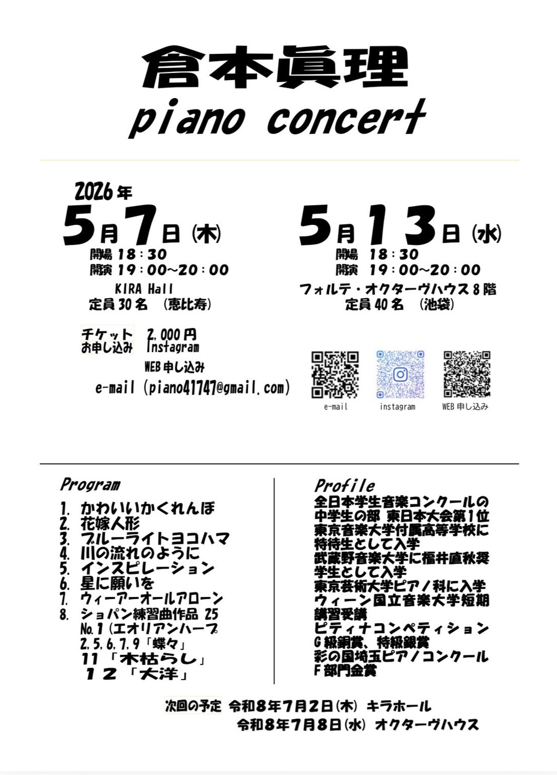 【開催日】2026年5月7日(木) 【開場】18時30分 【開演】19時00分 【出演】倉本眞理 【お問い合わせ】piano41747@gmail.com