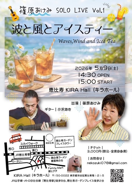 【開催日】2026年5月9日(土) 【開場】14時30分 【開演】15時00分 【出演】篠原あけみ、小沢あき 【お問い合わせ】nekozuki078@gmail.com